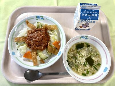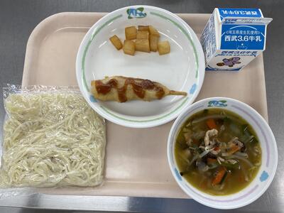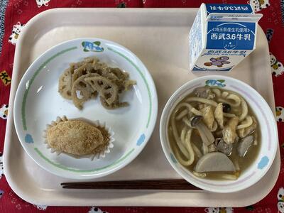 蓮根は、薄くスライスして油でカラッと揚げ、サラダにかけました。小手指小の人気メニューです。(担当者不在につき写真はありません。)