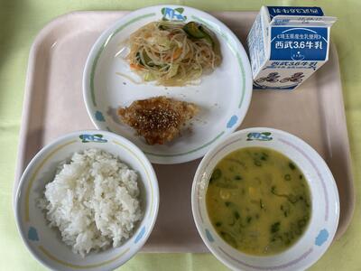 豚肉は、赤みそと酒、しょうゆ、みりん、砂糖、すりおろしたにんにくを混ぜ合わせた特製のタレによく漬け込んで焼きました。ご飯が進むメニューです。