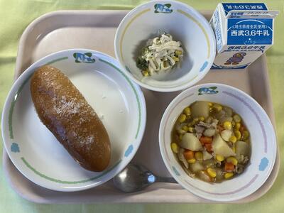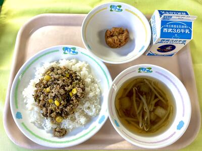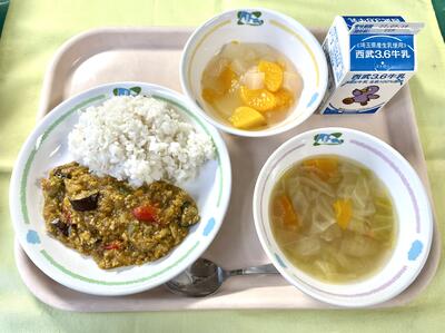 キーマカレーには、パプリカ、ピーマン、ナスなどの夏野菜をたっぷり入れました。秘密のフルーツポンチは、旬の野菜である「冬瓜」を甘く煮て、フルーツポンチを作りました。もっと野菜に親しんでほしいと思います。