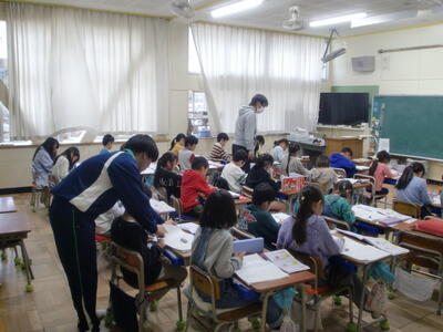 お手伝いしてくれた仕事は様々ですが、大いちょうの落ち葉はきから、学校運営協議会の会場づくり、低学年の授業の学習サポート、持久走記録会の練習に一緒に走る(中学生のパワーはすごい!)、休み時間に子供たちと一緒に触れ合う・・・などなど3日間、目一杯頑張ってくれました。
