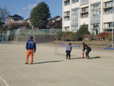 また、教職員による水消火器の訓練を行いました。なかなか思った通りに目標に当たらず、難しそうでした。