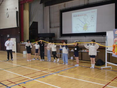 先生から、口から入った食べ物がおなかの中でどうなっていくのか、というお話や、胃や小腸や大腸の働き、またその長さを模型を使って詳しく教えていただきました。