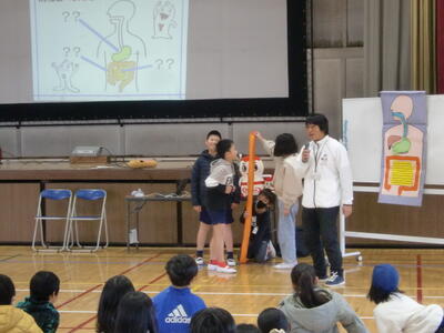 この教室の目的は、子供たちがおなかがどんな仕組みになっているのかを知り、毎日元気でいるために自分の生活を見直し、その改善を図るものです。
