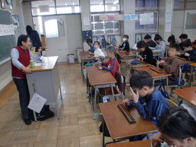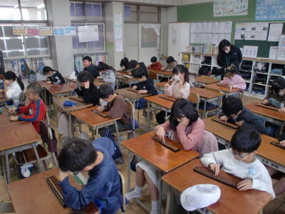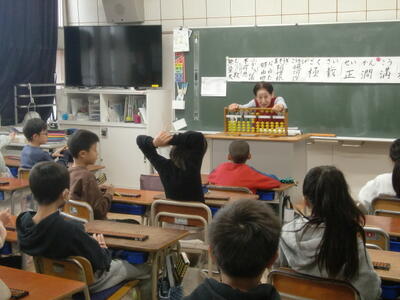 さて、今回も、以前、そろばん指導でご指導いただいた吉田様にお越しいただき、3年生の全学級のそろばん学習をご指導いただきました。